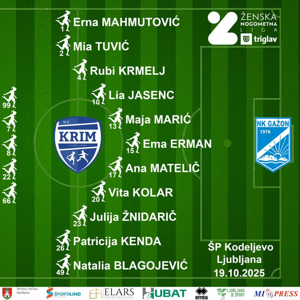 Okt192025Novice ženskeZačetna postava Krim Hubat, Krim Hubat – ŽNK Gažon Le-log, Ženska nogometna liga Triglav Ljubljana, Slovenija, 19.10.2025 19 oktobra, 2025Post navigationPreviousPrevious post:Ana Matelič izjava pred tekmo Krim Hubat – ŽNK Gažon Le-logNextNext post:Zmaga za nove tri točkeRelated PostsSŽNL licenca za sezono 2026/2730 aprila, 2026Foto galerija tekme ŽNK Olimpija – Krim PC Bolit26 aprila, 2026Trener Žiga Grgasović izjava po tekmi26 aprila, 2026Poraz od Olimpije26 aprila, 2026Začetna postava za mestni derbi z Olimpijo26 aprila, 2026DU15 zmaga za polfinale26 aprila, 2026