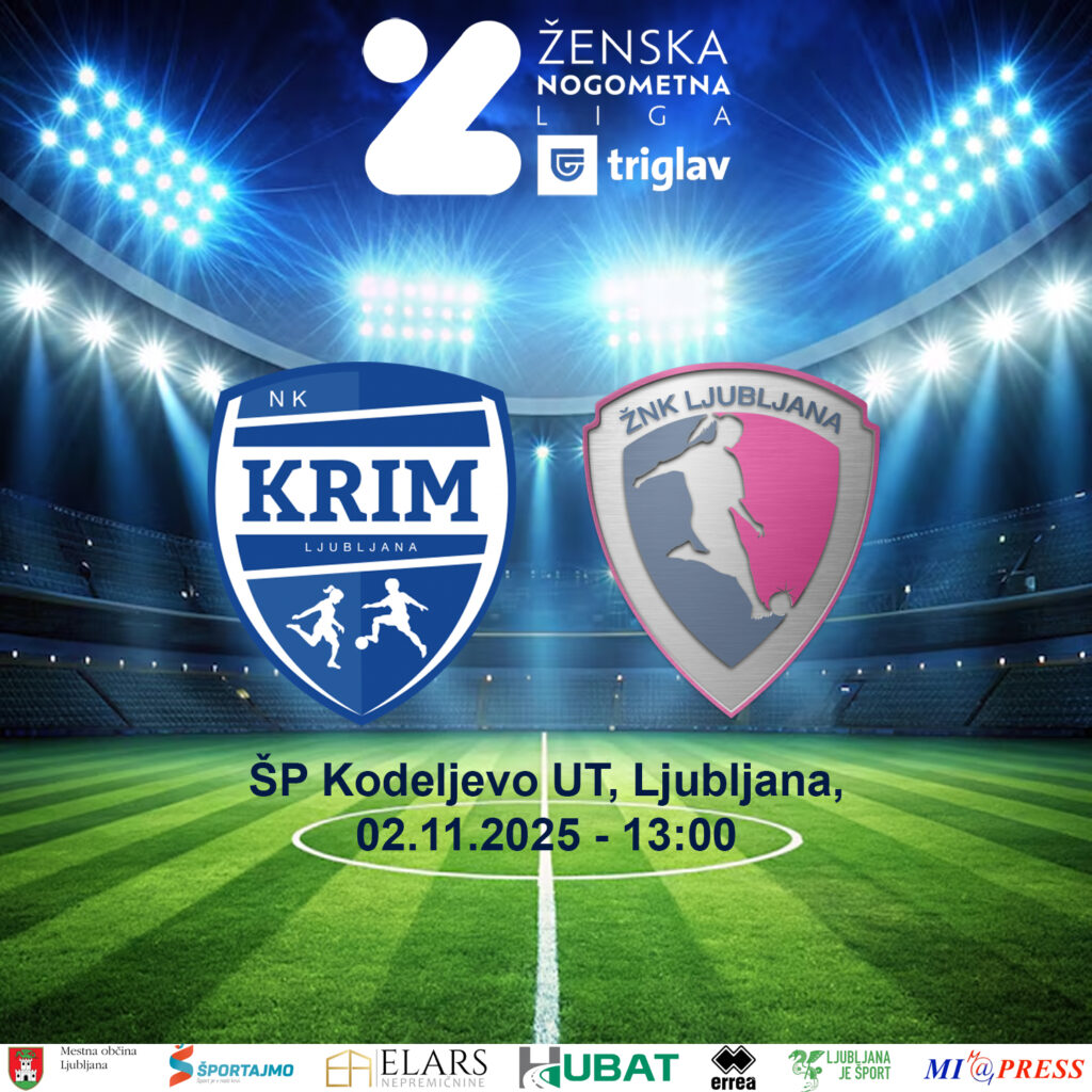 Okt312025Novice ženskeKrim Hubat – ŽNK Ljubljana, Ženska nogometna liga Triglav, ŠP Kodeljevo, Ljubljana, 02.11.2025 – 13:00 31 oktobra, 2025Post navigationPreviousPrevious post:Foto galerija tekme Krim Hubat – ŽNK Radomlje MedexNextNext post:Brina Sever pred tekmo Krim Hubat – ŽNK Radomlje MedexRelated PostsSŽNL licenca za sezono 2026/2730 aprila, 2026Foto galerija tekme ŽNK Olimpija – Krim PC Bolit26 aprila, 2026Trener Žiga Grgasović izjava po tekmi26 aprila, 2026Poraz od Olimpije26 aprila, 2026Začetna postava za mestni derbi z Olimpijo26 aprila, 2026DU15 zmaga za polfinale26 aprila, 2026