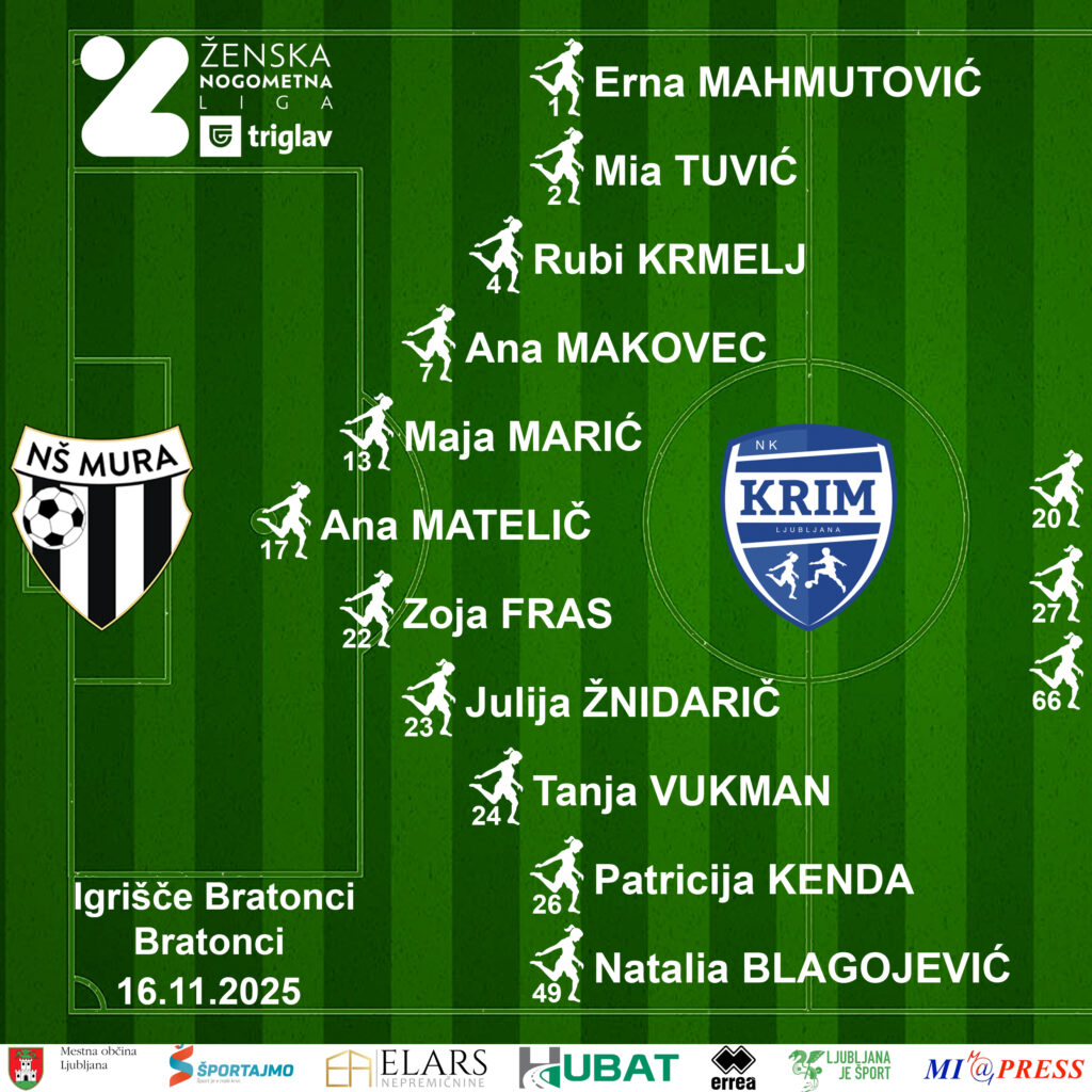 Nov162025Novice ženskeŽNK Mura Nona – Krim Hubat, Ženska nogometna liga Triglav, Igrišče Bratonci, Bratonci, 16.11.2025 – 13:30 16 novembra, 2025Post navigationPreviousPrevious post:Jubilejni 500. zadetek v zgodovini selekcije deklet DU17NextNext post:Poraz od aktualnih prvakinjRelated PostsSŽNL licenca za sezono 2026/2730 aprila, 2026Foto galerija tekme ŽNK Olimpija – Krim PC Bolit26 aprila, 2026Trener Žiga Grgasović izjava po tekmi26 aprila, 2026Poraz od Olimpije26 aprila, 2026Začetna postava za mestni derbi z Olimpijo26 aprila, 2026DU15 zmaga za polfinale26 aprila, 2026