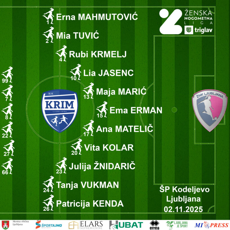 Začetna postava Krim Hubat – ŽNK Ljubljana Novice ženskeBy admin2 novembra, 2025 Začetna postava Krim Hubat, Krim Hubat – ŽNK Ljubljana Ženska nogometna liga Triglav Ljubljana, Slovenija, 02.11.2025 Details